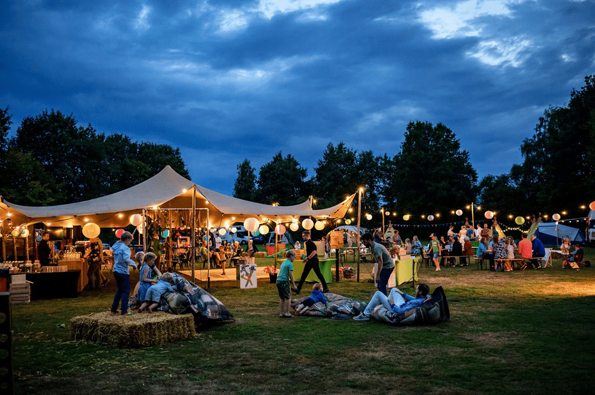 Drankje bij de vuurkorf, omringd door lampionnen en live-muziek onder een sfeervolle stretchtent. Beter kan niet!